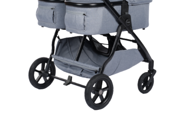 Otroški voziček M.Twin x ima veliko in priročno nakupovalno torbo z nosilnostjo do 5 kg. Izjemno prostoren shranjevalni prostor vam omogoča, da imate vse otroške potrebščine vedno pri roki.