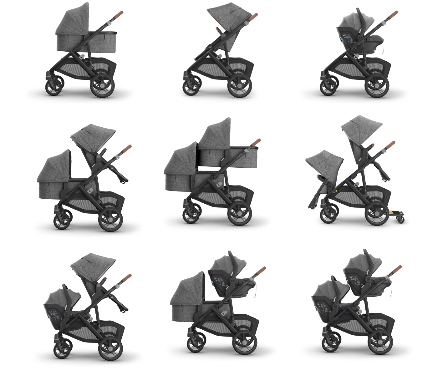 • Možne so različne konfiguracije vozička VISTA glede na potrebe staršev – dve MESA lupinici, dve košari, dva športna sedeža in vse vmesne kombinacije.
